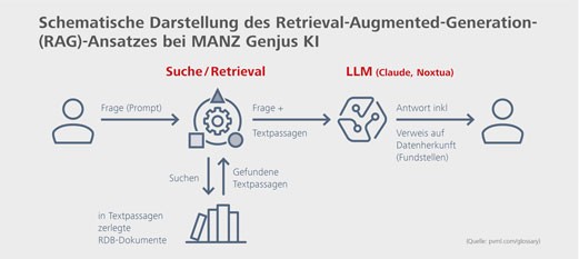 Zuerst erfolgt die Suche oder das Abrufen von Informationen (Mitte) aus der MANZ-Wissensdatenbank. Dabei wird die Anfrage hybrid mittels einer Stichwortsuche (wie in der RDB) und mithilfe natürlicher Sprachverarbeitung (semantische Suche) abgesetzt, um passende Textabschnitte aus der MANZ-Wissensdatenbank in Bezug auf die Fragestellung herauszufinden. Anschließend (rechts) werden die gefundenen Textabschnitte (Text-Passagen) gemeinsam mit der ursprünglichen Frage in ein generatives Sprachmodell eingespeist, das daraus eine Antwort erstellt.